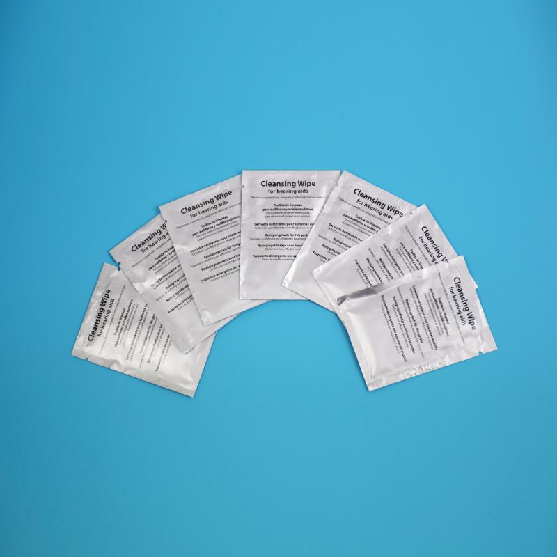 Einzeln abgepackte Tücher zur manuellen Reinigung der Hörgeräte.